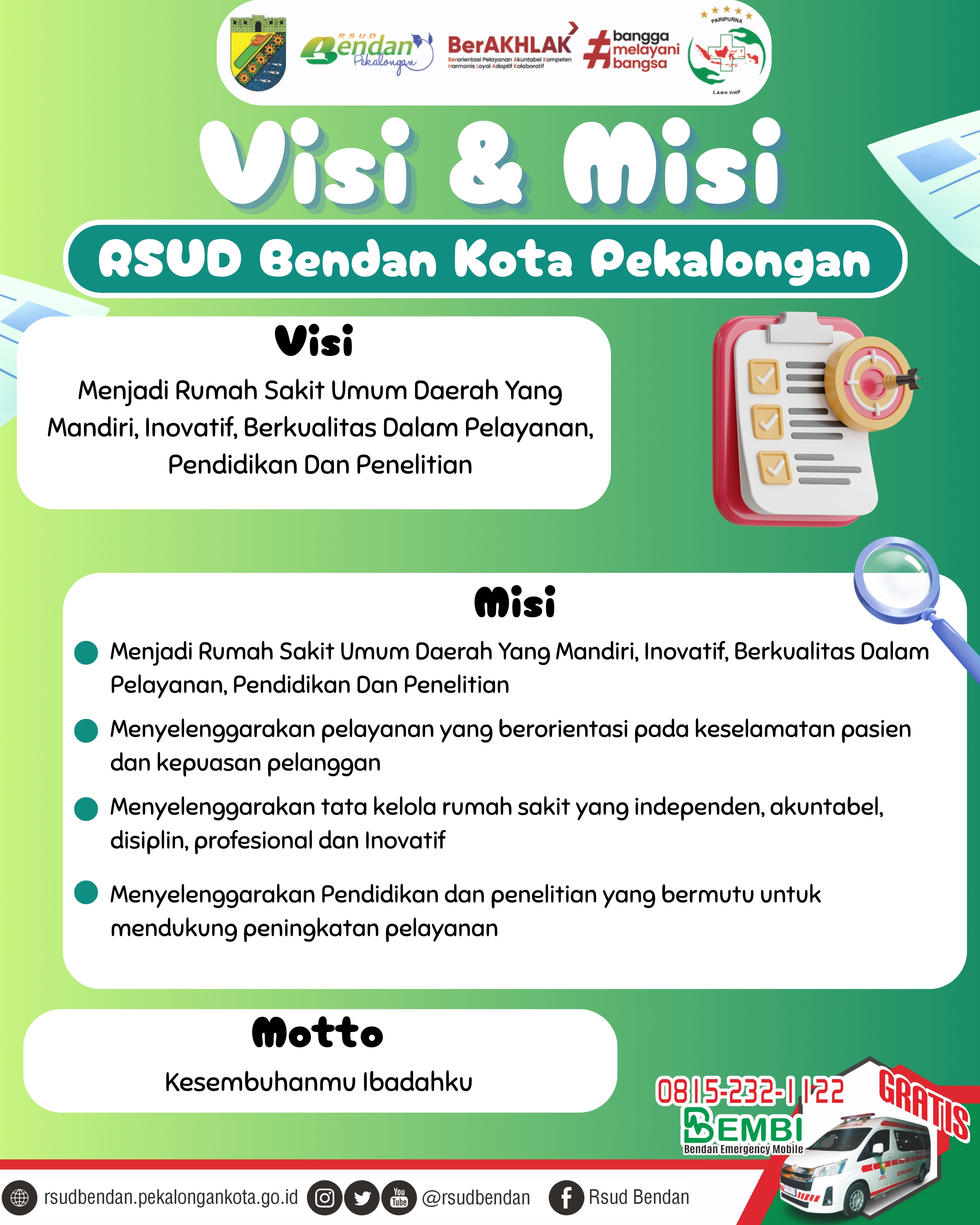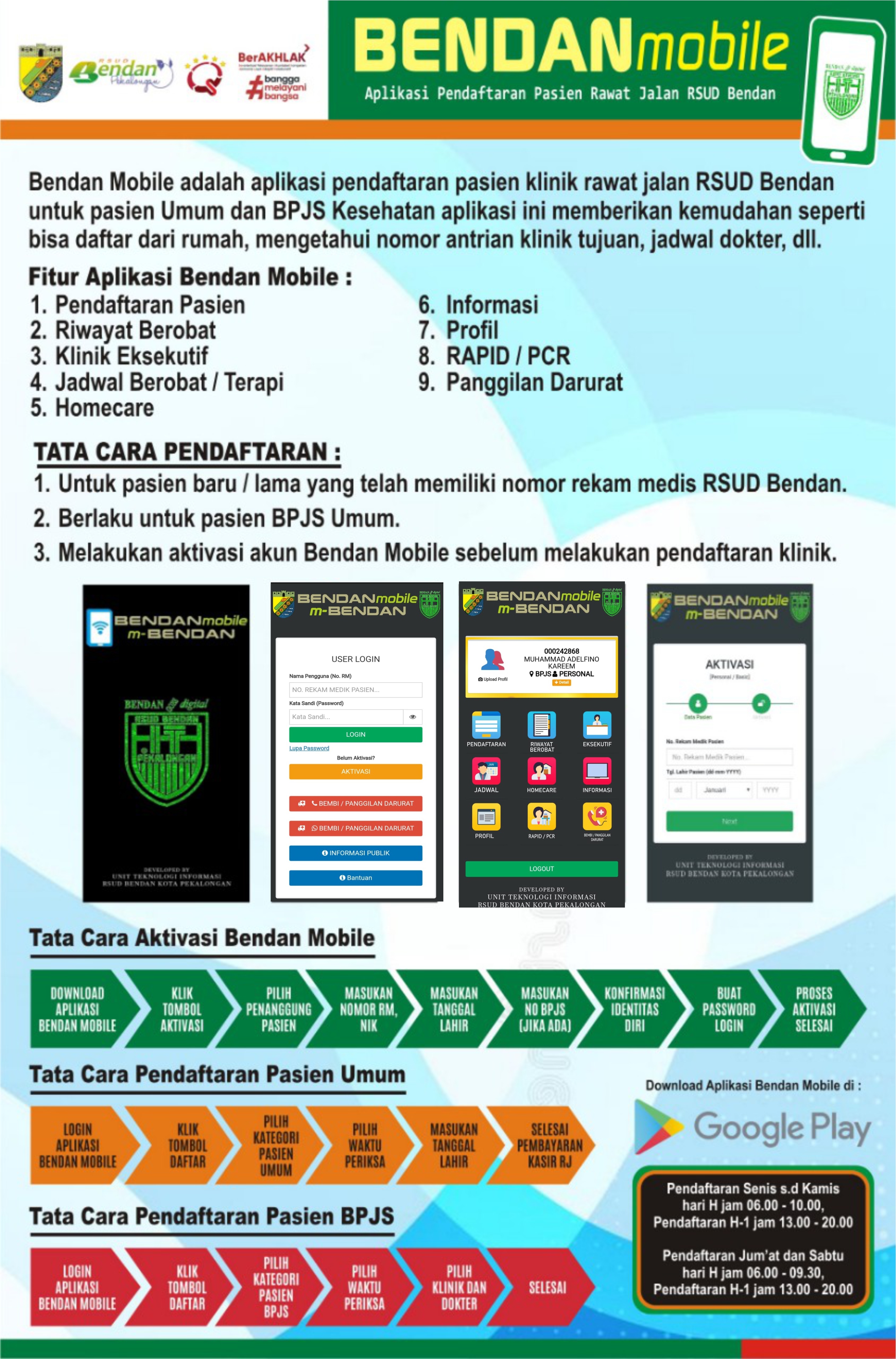 - Untuk informasi lebih lanjut, Anda dapat mengunjungi situs resmi RSUD Bendan di rsudbendan.pekalongankota.go.id atau mengikuti akun media sosial resmi mereka di Instagram, Twitter, dan Facebook dengan nama pengguna @rsudbendan.