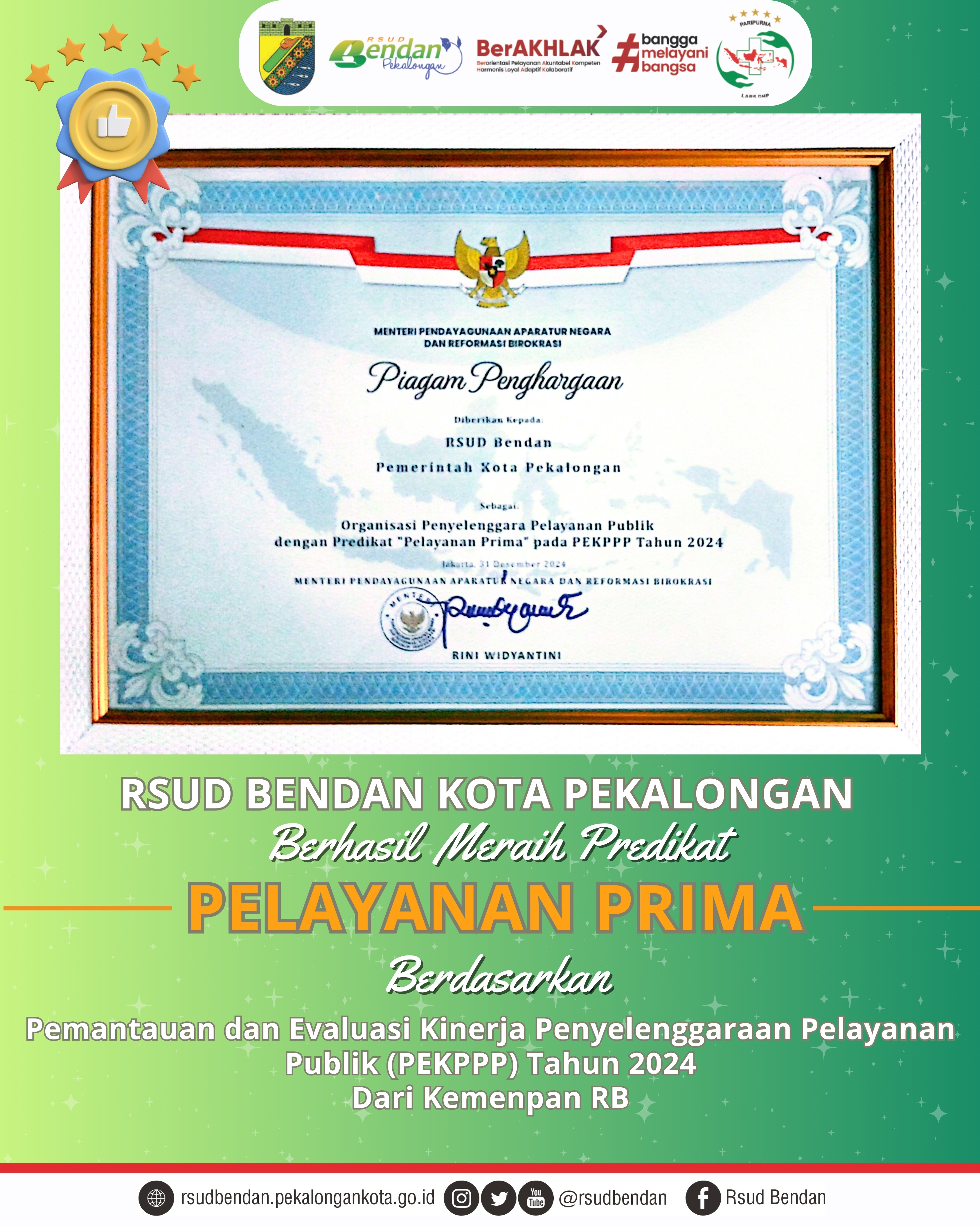 RSUD Bendan Kota Pekalongan kembali menorehkan prestasi membanggakan dengan meraih predikat Pelayanan Prima dalam Pemantauan dan Evaluasi Kinerja Penyelenggaraan Pelayanan Publik (PEKPPP) Tahun 2024. Penghargaan ini diberikan langsung oleh Kementerian Pendayagunaan Aparatur Negara dan Reformasi Birokrasi (Kemenpan RB) sebagai bentuk apresiasi atas komitmen dan konsistensi RSUD Bendan dalam memberikan pelayanan terbaik kepada masyarakat.