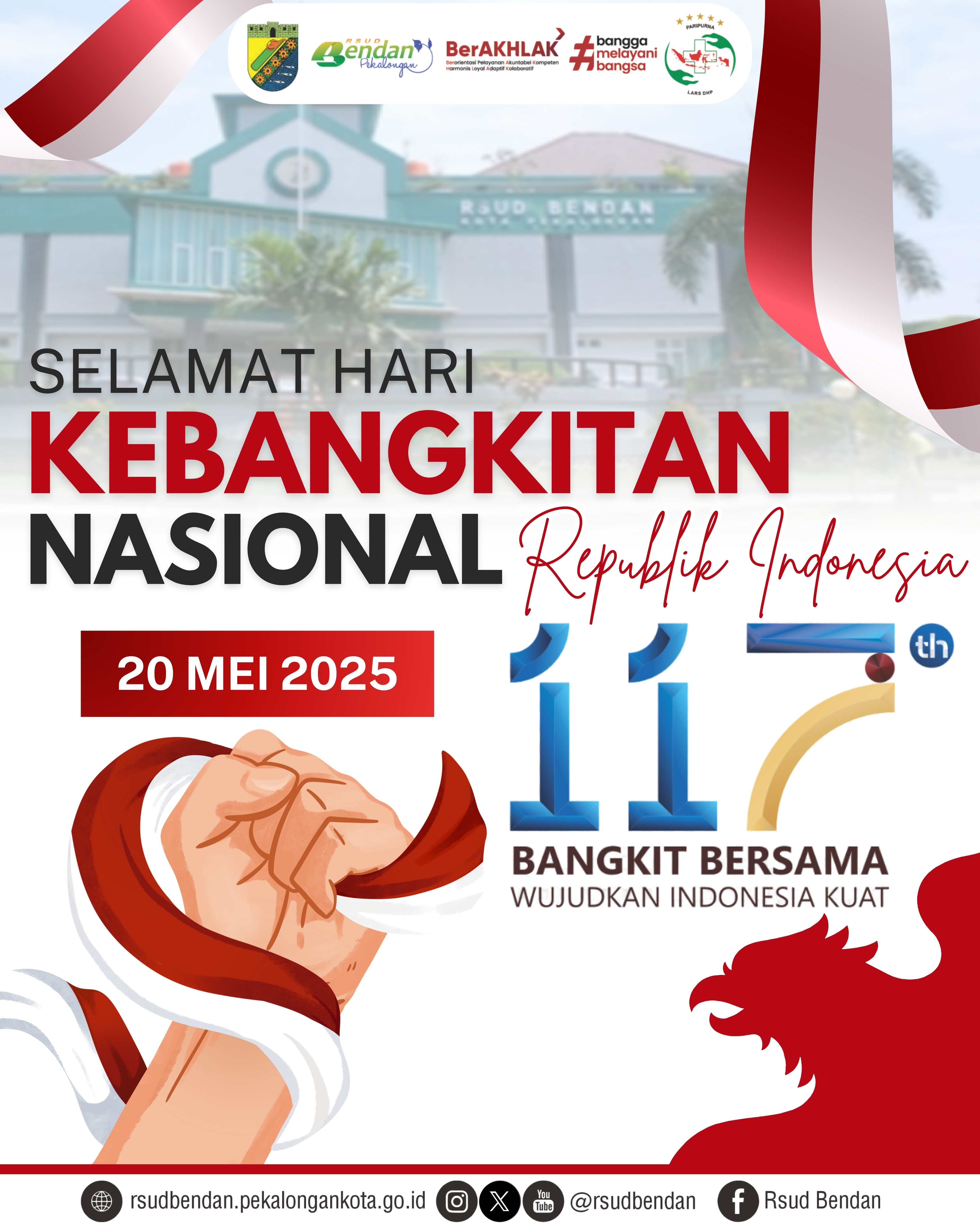 Hari Kebangkitan Nasional ke-117 menjadi momentum penting bagi seluruh rakyat Indonesia untuk kembali menyalakan semangat persatuan dan gotong royong. Di tengah tantangan zaman, mari kita kobarkan kembali semangat perjuangan para pahlawan yang telah meletakkan dasar-dasar kebangkitan bangsa ini. RSUD Bendan turut serta memperingati momen bersejarah ini sebagai wujud komitmen dalam membangun negeri melalui pelayanan kesehatan yang berkualitas.