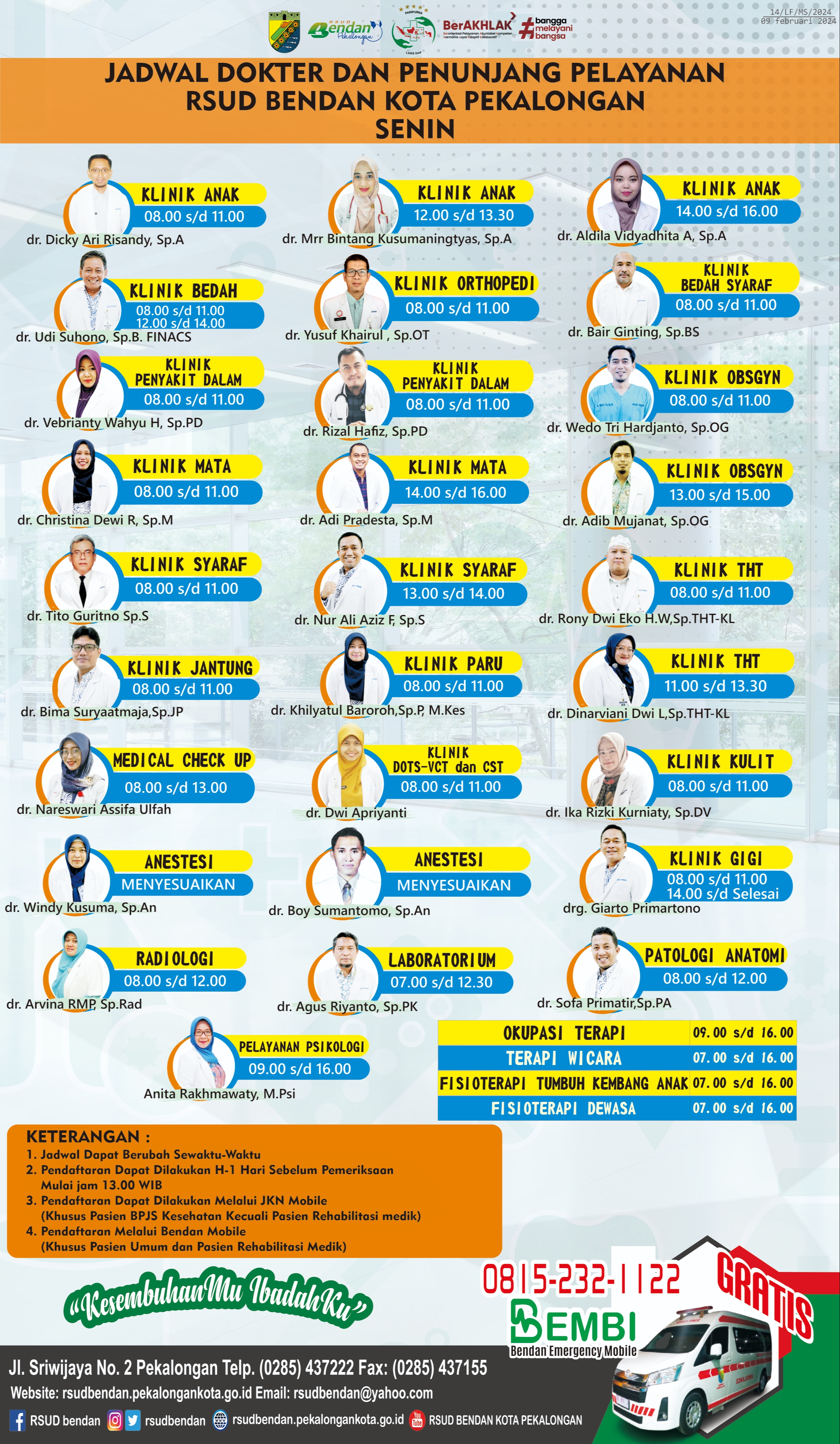 JADWAL DOKTER DAN PELAYANAN PENUNJANG RSUD BENDAN KOTA PEKALONGAN SENIN